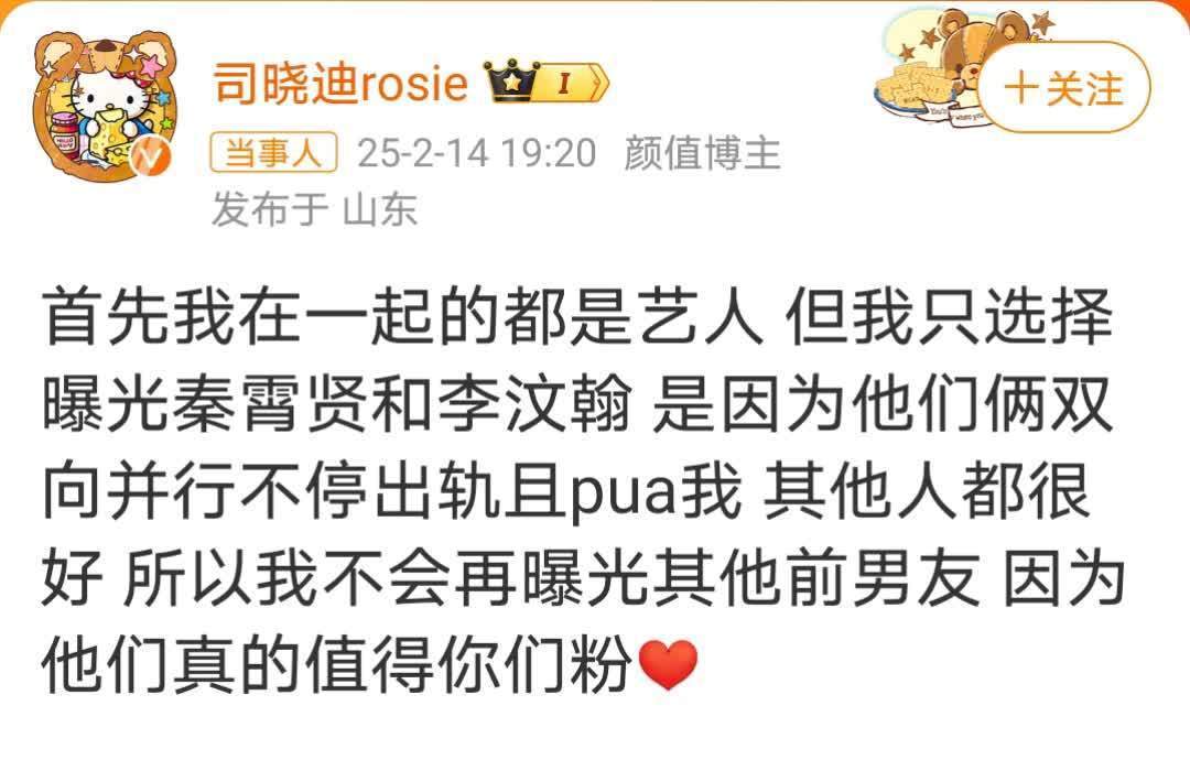 2025年情人节,司晓迪将矛头对准偶像团体出身的李汶翰。「恋爱时像笼中鸟」的控诉配上十张聊天记录截图,瞬间引爆舆论。更绝的是她放出的「男扮女装」照片——李汶翰戴着长假发、穿女性睡衣的样子,让网友惊呼「塌房猝不及防」。她还声称被李汶翰精神控制,同时与三位女性暧昧,这些指控像精准投放的炸弹,把「偶像失格」的讨论推向高潮。 有意思的是,司晓迪的爆料总带着强烈的「个人叙事」。她自称因情伤患上抑郁症,每次爆料都以「受害者」姿态出现,这种脆弱感让部分网友产生共情。但质疑声也从未停止:2025年10月她指控钢琴家李云迪「酒店不当行为」后删文,2026年初又宣称「睡遍所有顶流」遭鹿晗工作室火速辟谣,反复横跳的操作让「炒作」争议甚嚣尘上。 如今再看这场场风波,司晓迪的「成功」并非偶然。她太懂流量密码了——选在情人节、新年等节点爆料,用聊天记录、照片等「实锤」制造可信度,瞄准粉丝基础庞大的顶流下手。更关键的是,她踩中了公众对娱乐圈「完美人设」的怀疑心理,每次爆料都像在撕开行业光鲜外表下的暗角。只是这把「爆料双刃剑」能挥多久?当吃瓜群众逐渐审美疲劳,当法律风险步步紧逼,下一个被推上风口浪尖的,又会是谁?